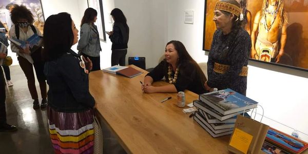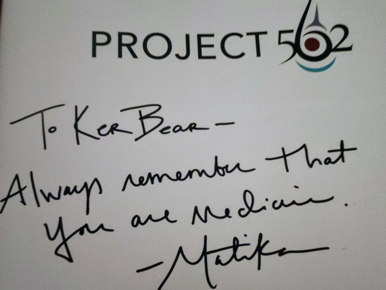 I remember learning about Matika Wilbur during a time when I was taking classes at Napa Valley College. I remember my Professor had a writing prompt to inform others about something unique and challenging about our culture. At that time there was a lot going on with trying to remove Native mascots from local High Schools and so I decided to do a research paper on this topic. I found a T.E.D. Talk with Matika describing the negative impact that stereotypes and how this contributes to a lot of the challenges we face today. At that time, there still was not a lot of positive or accurate visibility about Indigenous people and I really appreciated what she shared. Over the years, I continued to follow what she was doing in our community and how she had an interest in interviewing, as well as photographing many Indigenous people all over Turtle Island to help change the narrative about our people and inspire positive visibility. This work meant a lot to me, and thought about many of the conversations that I have had with my Grams, my children and others in community about our experiences. After 10 years, Matika completed her project 562 and she published a book that she was beginning to tour throughout the Pacific West. I found a way to travel to Santa Monica and attend a speaking event and later meet her to sign the book I purchased. It was an incredible evening that warmed my heart and I was thankful for the experience. When I returned to my hotel room later that night and opened the page to see the signature, I did not realize what she had wrote when I was talking with her. I had written my name on a post-it and thought that would be it and include her signature.